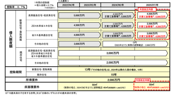 子育て世帯等の住宅取得環境が厳しさを増していること等を踏まえ、住宅ローン減税について、子育て世帯等の借入限度額の上乗せ及び床面積要件の緩和措置を令和7年も引き続き実施されています。なお、住宅ローン控除をはじめて受ける場合は、住宅の区分に応じた提出書類を添付して確定申告をする必要があります。